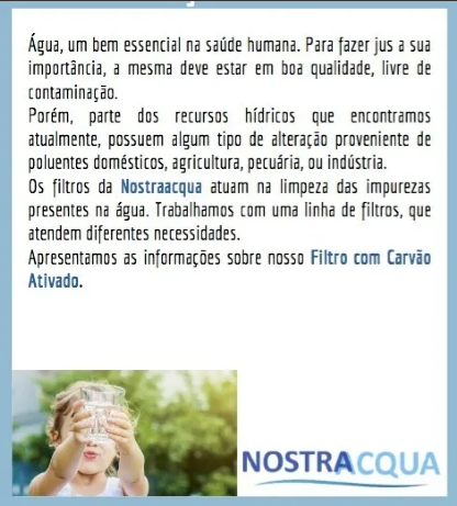- Meio Filtrante: Carvão Ativado utilizado para remoção de cloro, odor e sabor da água. Pressão de trabalho recomendada: entre 0,5Kgf./Cm² até 3Kgf./Cm².