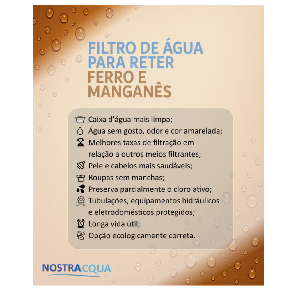 - Proporciona uma ótima qualidade na água filtrada, removendo a coloração e gosto característico dos metais.